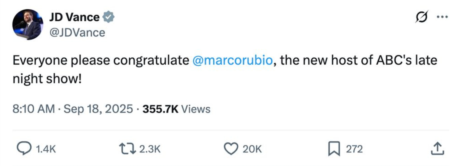 Look, everyone, JD Vance found the “Marco Rubio does all the jobs” joke! Congratulations JD Vance!