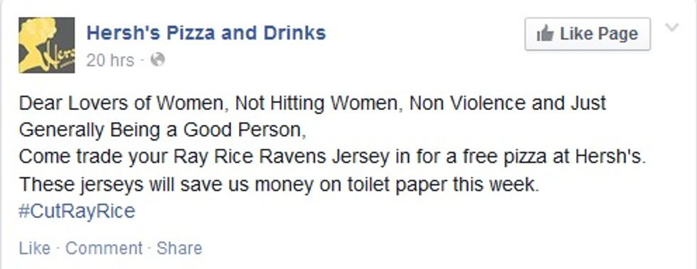 Now that the disgraced Ravens f'ball star has been fired, several restaurants in Baltimore are doing their part to help recycle now-unwanted Ray Rice paraphernalia. We think that the owners of Hersh's Pizza and Drinks have the right idea: