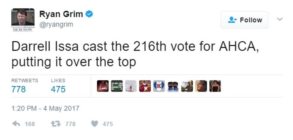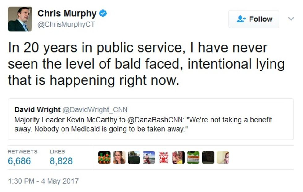 But first, let's start sifting through some of the reactions to the House's vote today to undo Obamacare, the greatest reduction in the uninsured rate in history, all for the sake of winning a great big Fuck You to the black guy who was president. We're just going to go almost at random here, because the internet, as is required after any catastrophe, is blowing up. From Connecticut Democratic Senator Chris Murphy, something we can all agree with: