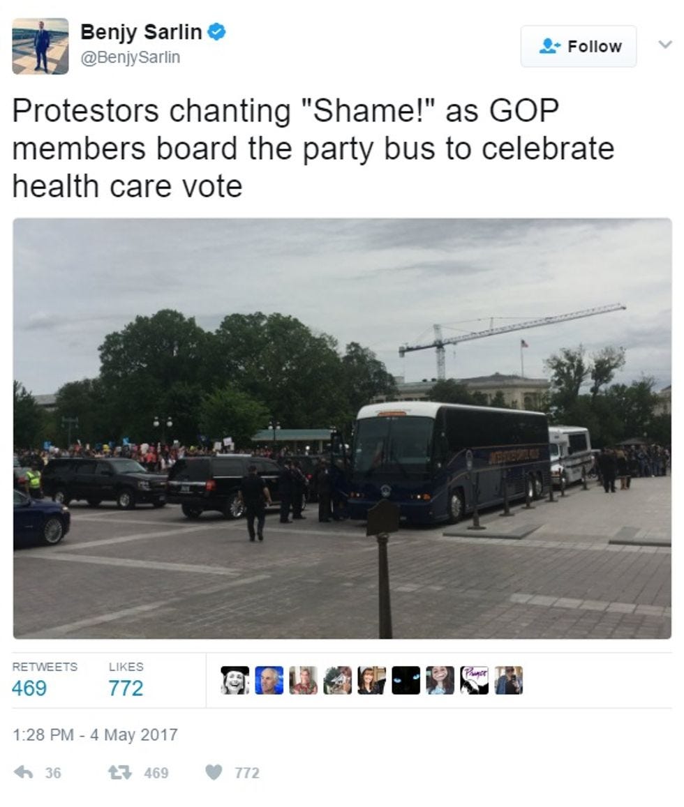 House Republicans couldn't even make it to their Party Bus before a crowd of protesters gathered to remind them we're not going to forget what happened today: