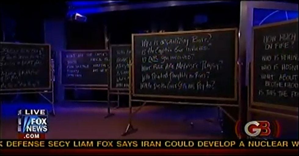 Glenn Beck seems to think this is the most important idea he has ever had, so let's pay attention! Sure, this video appears long, but if you look at it on a conclusions-jumped-to-per-minute basis, it all goes by pretty quickly. LOOK YOU GUYS, GLENN BECK'S CONSTRUCTION-PAPER CAMPFIRE HAS JUMPED OVER TUNISIA AND INTO EGYPT. The s'mores have come home to roost! And now the world is going to end. Just like it does on every Glenn Beck broadcast.