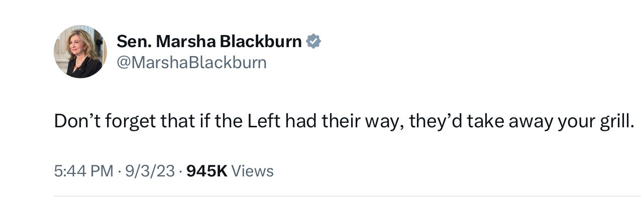 Over Labor Day weekend, she also added “grills” to the list of convenience items that the Left wants to deny Americans. This obviously isn’t true, but Blackburn only ever knows enough about an issue to lie about it.