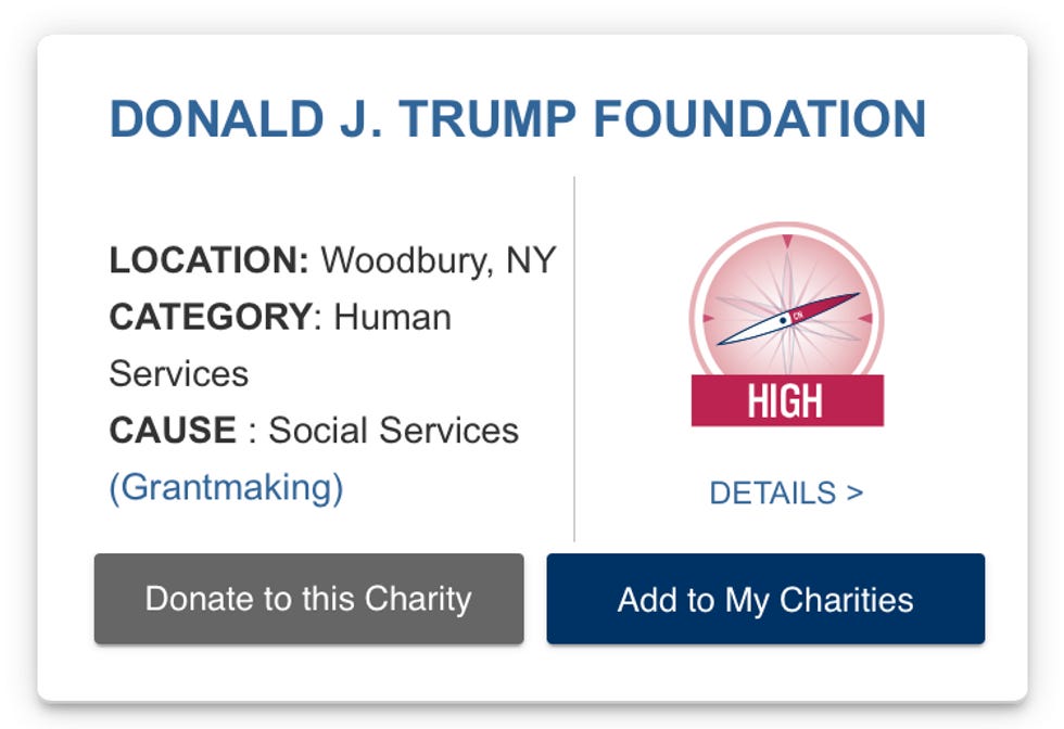 But Clinton's is marked "low" and Trump's is marked "high"! Oh, that means low RISK and high RISK? Well, Charity Navigator, you could make those seals a little clearer. Because Guidestar did a whole book reportcomparing Trump's foundation to Clinton's. Yeah, we know you Trump guys don't give a crap about actual data, LOL! It's way more fun to pretend that spending $264,000 to renovate a public fountain outside the Trump Plaza Hotel is SELFLESS VIRTUE, and paying to fly doctors to Africa is SLUSH FUND.