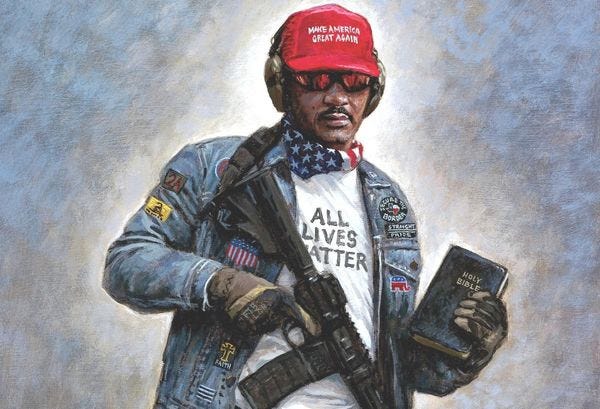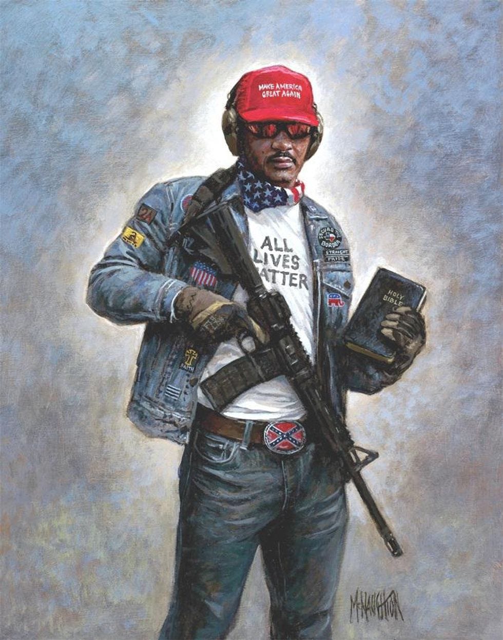 The racially ambiguous fellow with the AR-15 there — McNaughton says he's "neither black not white," so we'll assume it's a middle aged Michael Jackson — is adorned with all sorts of messages we suppose are intended to make libs wail and gnash their teeth. Let us catalogue these many artifacts of the Kitscher wars.