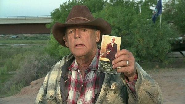 "He told reporters yesterday that his family’s fight against the federal government is nothing less than the fulfillment of the “white horse prophecy,” a bit of Mormon religious ephemera holding that Joseph Smith supposedly prophesied that Mormons would rescue the US Constitution — which of course was inspired by God — from some unspecified future crisis."Wut.
