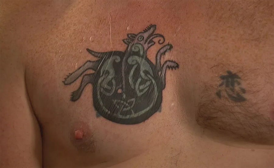But goddamn, as this screenshot from a family wedding reception video shared with the podcast makes clear, that’s not a tattoo that “closely resembled a Nazi symbol,” it’s just plain a Nazi symbol.