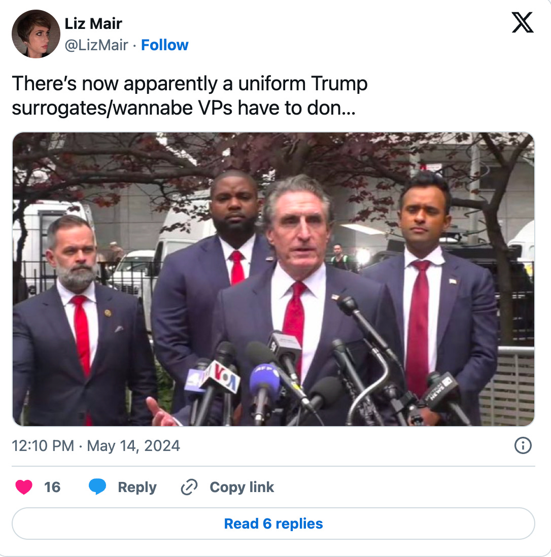 Here’s part of yesterday’s parade of human outhouses, who showed up to read lines about the judge’s daughter Trump literally fed to them. And oh God, look what they’re wearing: