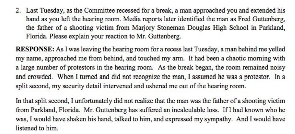 As for that incident during the confirmation hearings when Kavanaugh blew off Fred Guttenberg, the father of a Parkland shooting victim, Kavanaugh finally said in his written responses that he's very sorry and it was very chaotic and he didn't realize that was Fred Guttenberg and not one of those terrible thug protesters. OK sure, whatever.