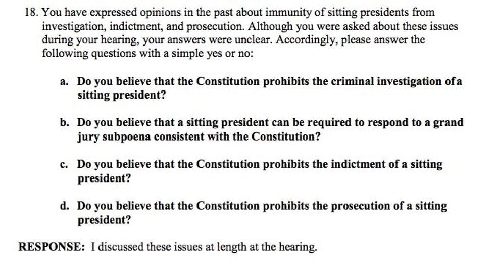 Indeed a running theme of his "answers" are that he cannot talk to you about such things, you mere United States senator. Like for instance, should a JUDGE get impeached for LYING UNDER OATH? Yes or fuck yes? He cannot say!