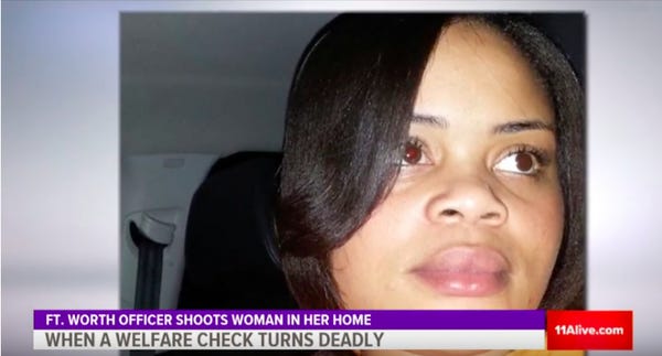Atatiana Jefferson was shot dead in her own home Saturday in front of her eight-year-old nephew. Fort Worth, Texas, police officer Aaron Dean killed the 28-year-old black woman, senselessly and callously. Dean was responding to a wellness check from one of Jefferson's neighbors, who was concerned that the doors to her house were open late at night. I don't know why he called the police. "Protect and serve" does technically apply to black people, but it's not always worked out in practice.