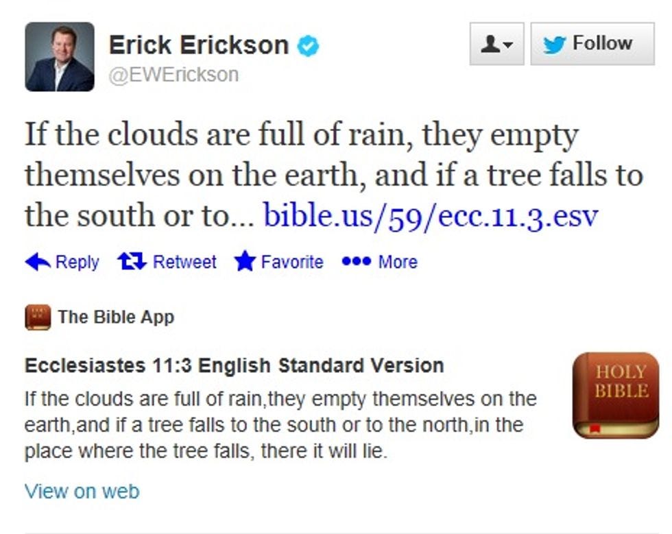 Or as terrible heathen Steve M translates: "Shorter Erick Erickson: Tornadoes are God's will, so stop whining." Also, no matter where you go, there you are.