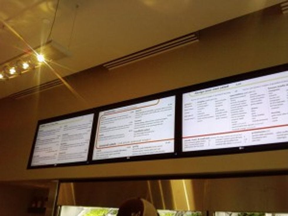And, what would a salad place transplanted to DC from California be without lots of eco-friendly elements? Let's see: they have fancy teevee screens so they don't waste paper printing new menus when they change their menu, which they do, seasonally; their packaging is 100% compostable and biodegradable; and their tables are made from 100% recycled detergent bottles...