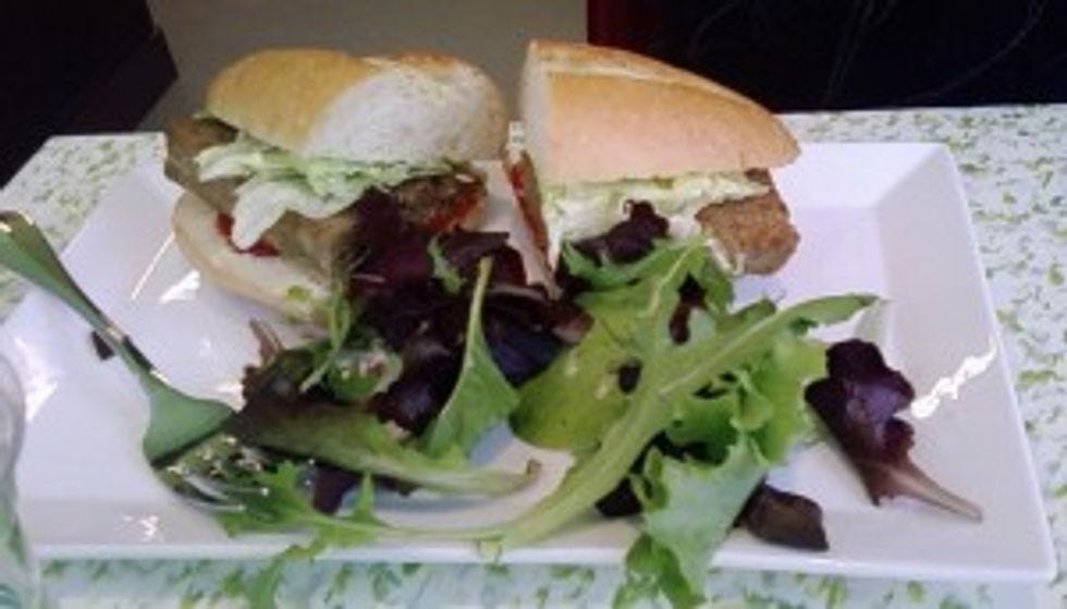 Or, if you prefer, you can get a very healthy, delicious sandwich instead. Here we have an awesome, very good sandwich known as the Loafer. It's made with American kobe meatloaf, re-roasted tomatoes, garlic mayo, and butter lettuce and is served on an acme bread torpedo roll, whatever that is. You can't make your own sandwich, but they do offer five bold, interesting sandwiches and, of course, there's a veggie option.