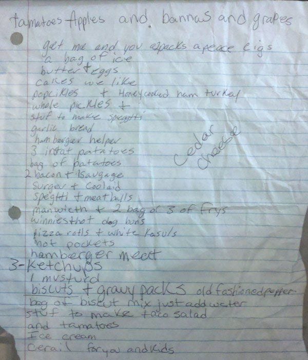 On the bright side, she can maybe make those cakes we like, using the white flour and the 33 80-oz packages of white sugar. Or console herself by starting Atkins and kicking it off with a veritable feast of ground beef, all uncooked beef steaks, sliced bacon, chicken legs, ground chuck beef, turkey, boneless ham, all pork chops, and boneless chuck roast.