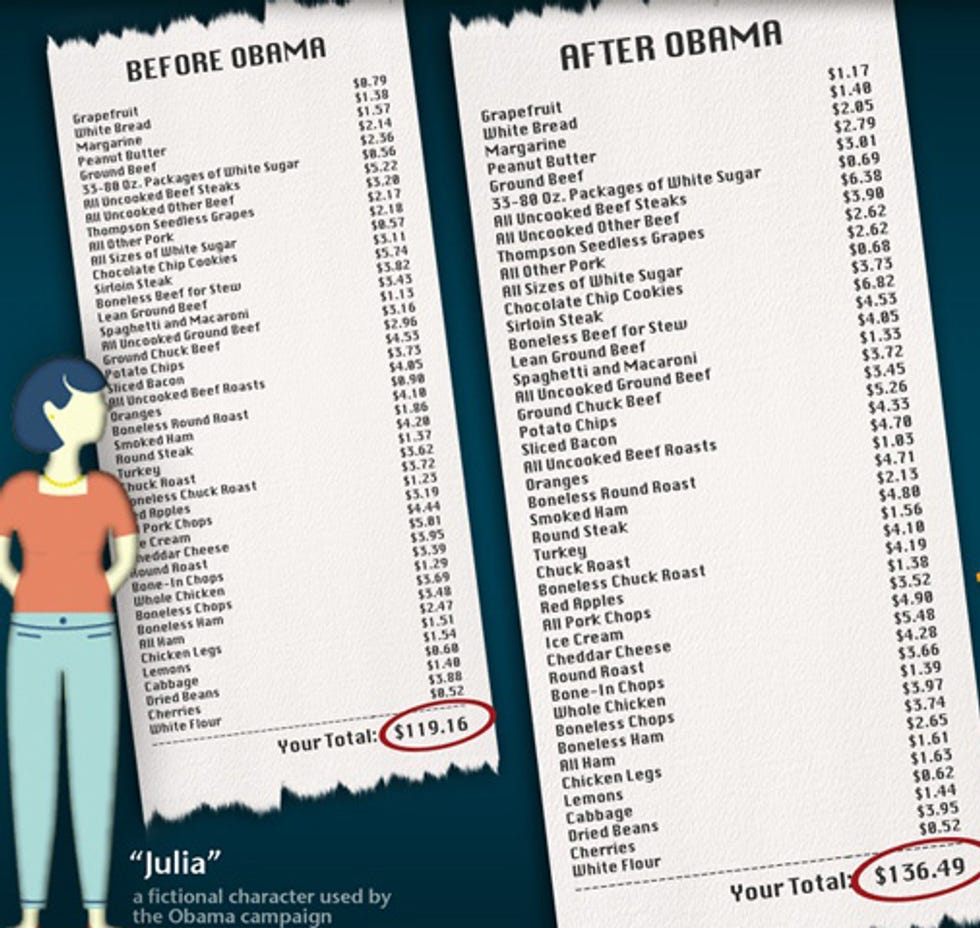 Remember “ Julia ,” the main character in an Obama campaign website who goes through her childhood and adolescence suckling off the government teat before becoming a web designer and taking birth control pills? Well, now she is back, courtesy of a GOP Political Action Committee, and her grocery bill is TOTALLY OUT OF CONTROL. This is because 1) she seems to be buying enough groceries to assemble an entire cow, from scratch and 2) because Obama is in charge of the weather AND the free market and has used his magical weather powers to cause this summer’s drought and the subsequent rise in food prices. But for the purposes of critical analysis, here is her shopping list. We are saddened to report that she is not planning on picking up any cedar cheese. Or those cakes we like. We'll get over it though, with effort.