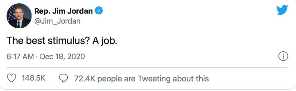 House Rep. Jim Jordan went full, pre-redeemed Scrooge Friday, declaring on Twitter that the best stimmy is — wait for it — a JOB.
