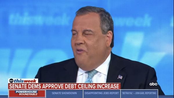 CHRISTIE: You know, there's all this talk about people wanting bipartisanship. But there were two examples, George, of when Republicans have actually come over to help Democrats on issues. You've had the infrastructure bill in the Senate. You had 19 Republican senators come with the Democrats. And now you had the debt ceiling, where 10 came to extend the debt ceiling. And both times, Democratic leadership has smacked back at Republicans. On the infrastructure bill, a vote was promised by Nancy Pelosi, she broke that promise. And now, right after the 10 votes, Chuck Schumer goes to the floor to absolutely excoriate the Republican Party. If we want to encourage bipartisanship, after people actually do it, kicking them in the face is not the way to get them to want to do it again.