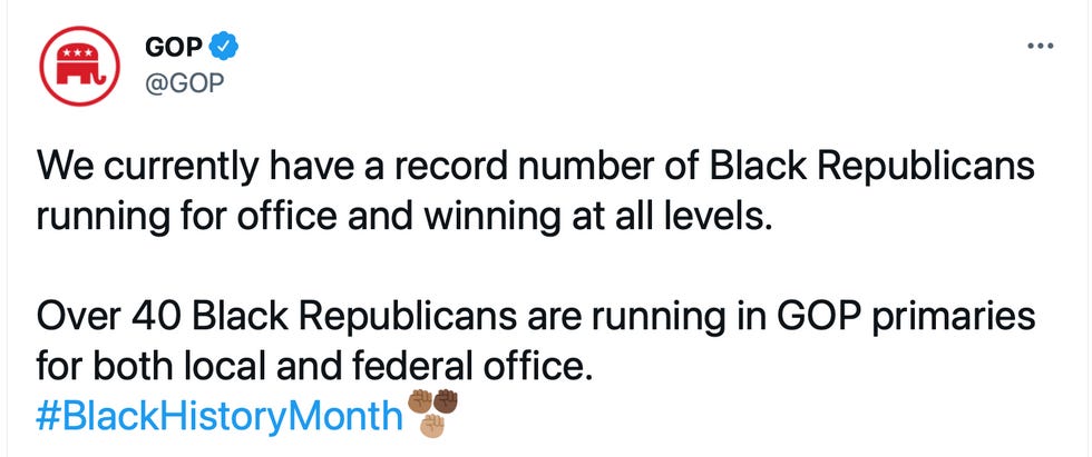 However, the GOP is proud to announce that a small number of Black people identify as Republicans. No one’s perfect. The GOP’s official Twitter account boasted, "We currently have a record number of Black Republicans running for office and winning at all levels. Over 40 Black Republicans are running in GOP primaries for both local and federal office.” Next to the hashtag #BlackHistoryMonth was three raised Black fists of different shades. Yeah, really.