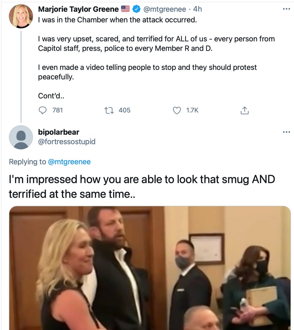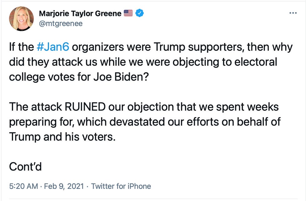 GREENE: If the#Jan6 organizers were Trump supporters, then why did they attack us while we were objecting to electoral college votes for Joe Biden? The attack RUINED our objection that we spent weeks preparing for, which devastated our efforts on behalf of Trump and his voters.