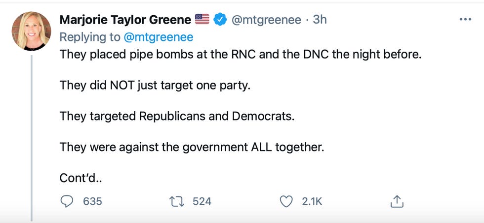 GREENE: They placed pipe bombs at the RNC and the DNC the night before. They did NOT just target one party. They targeted Republicans and Democrats. They were against the government ALL together.