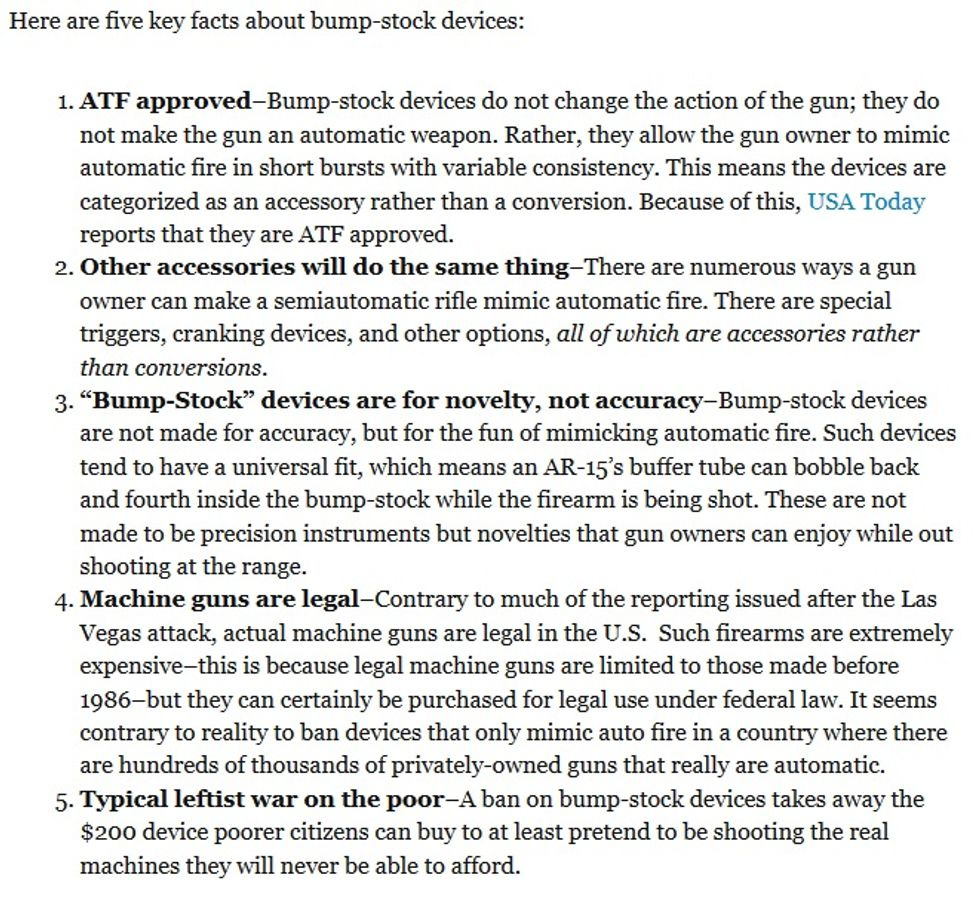 Looks like somebody never learned the difference between a "fact" and an "opinion." We're especially impressed by item #3, where even Hawkins acknowledges there's no real practical use for bump stocks, since they actually make semiautomatic rifles less accurate. Number 5 is a laugh, too: Discrimination against the poor and their absolute constitutional right to "at least pretend to be shooting the real machines they will never be able to afford."