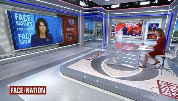 Host Margaret Brennan began by interviewing Kristi Noem, governor of one of the two redundant Dakotas (the southern one), fresh off her Saturday CPAC appearance where she pushed COVID lies and gave herself a pat on the back.