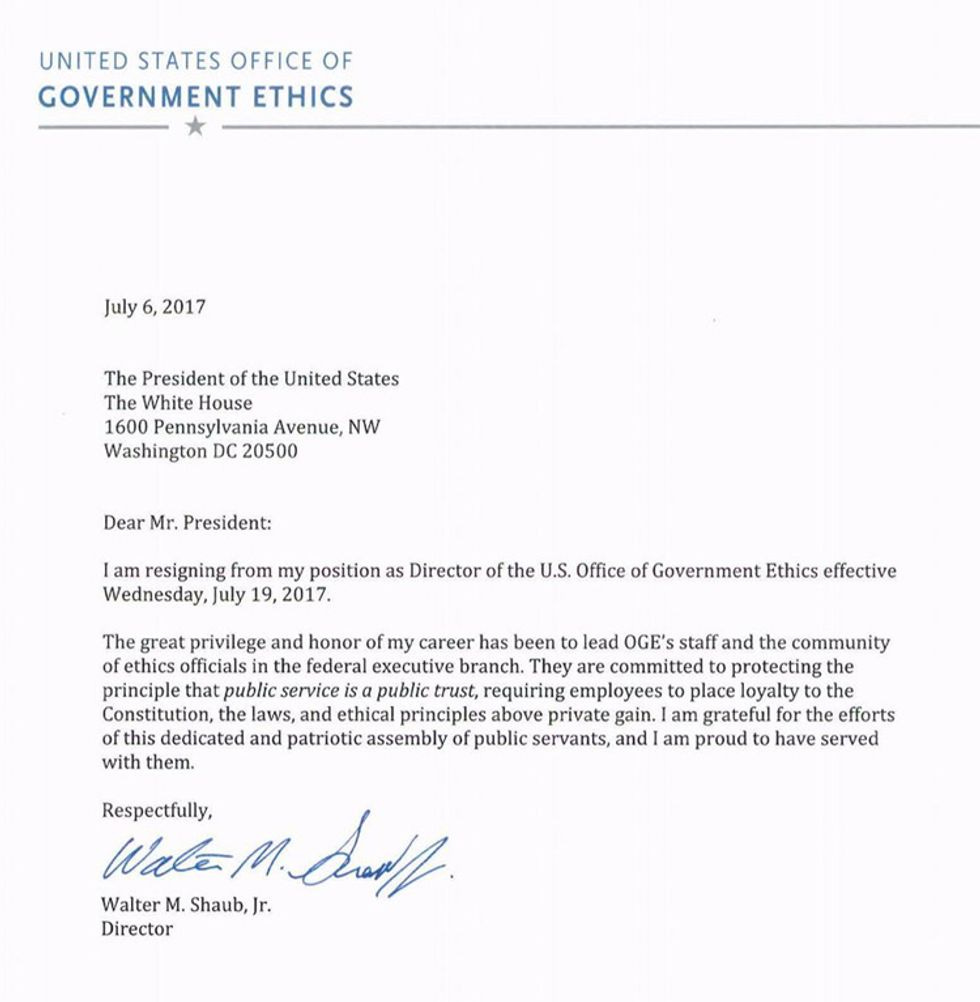 Walter Shaub, the director of the Office of Government Ethics, finally had his fill of Donald Trump, the Trump family, Donald Trump's shady excuses for ethics, Trump's shady businesses, the Trump family businesses, or pretty much anything with a T and ending with an ump, and has submitted his resignation effectivegoddamn immediatelyJuly 19. Shaub, who has been trying to get Trump to conform to even the most rudimentary of ethical standards since Trump arrived in Washington, finally got tired of being the canary in the ethics coal mine, so he cheeped one last time and keeled right over:
