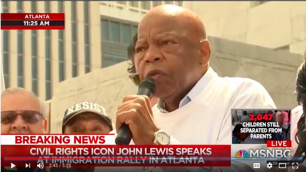 "Look, you know, I've been talking for some time and getting in trouble. It's time for some of us to get in good trouble, necessary trouble," Rep. Lewis suggested. "In the final analysis, we may have to turn America upside down to set it right side up, but whatever we do, do it in an orderly, peaceful and nonviolent fashion."