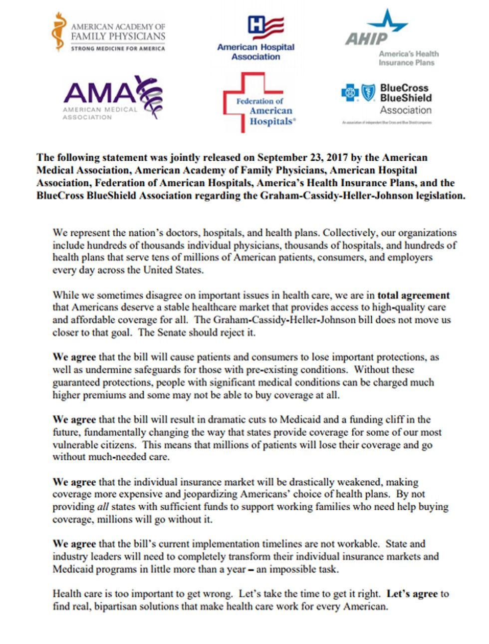 Shorter Version: The "new" Graham-Cassidy is every bit as bad as the previous one, and we'd like to hope that Lisa Murkowski and Susan Collins will be smart enough to see that that even with the shuffling-around of shrinking healthcare dollars, their states would still be worse off -- and other states would see enormous cuts. The Brookings Institution estimated last week that 32 million people would lose insurance if this mess becomes law, and the changes released last night would only change slightly where they'd lose their insurance. And there's nothing in this version to overcome the opposition of pretty much the entire healthcare system, which released this letter Saturday: