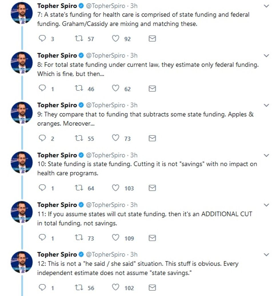Alaska, Arizona, Kentucky and West Virginia would still receive less funding under Graham-Cassidy compared with Obamacare, according to Topher Spiro, a health analyst with the left-leaning Center for American Progress. In Twitter postings, he said the bill’s authors were accounting for money states saved as a result of ending Obamacare’s Medicaid expansion to low-income adults, which is overwhelmingly funded by the federal government but requires states to pay a fraction of the cost.
