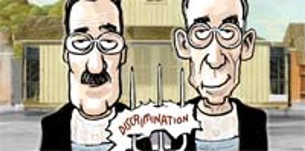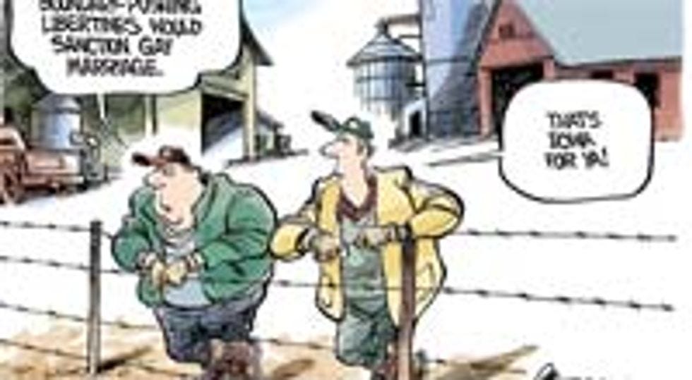 This guy, though ... this guy doesn't look so excited, does he? Dude on the right, I mean. Dude on the left is all like, "Huzzah! We can totally get married now, Clem! And I won't have to pay taxes on this simple Iowa farmhouse when you die before me, which you inevitably will, because you look to be about forty years older than I am!" But Clem, he's got some second thoughts. He's thinking, "Wait, so this is it? I'm gonna be married to this guy for the rest of my life? Because ... I mean, he's not really all that special. Sure, he's younger, I guess that's nice, but, I mean, what's the deal with that shirt? No color, just kind of shapeless ... SNOOZE! Don't I deserve someone more exciting? Or is that just a myth? Should I just be happy with what I've got?" These are the new terrible choices that the Iowa Supreme Court is forcing on innocent gays. Shame!