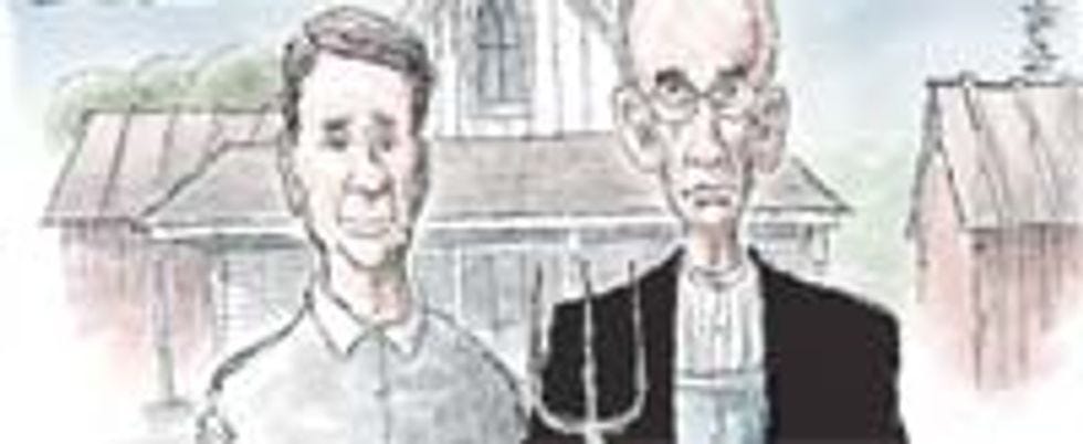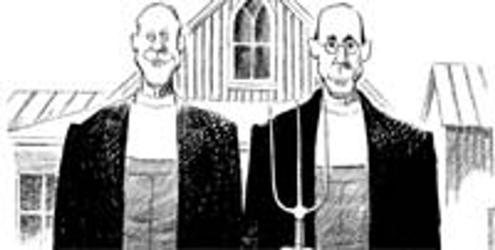 OH MY GOD WHAT HAVE THOSE GAY LIBERALS DONE NOW? They have taken Iowa, possibly our least gay state, and gayed it all up, with the gay marrying, and ... such! One sign of the state's previous extreme heterosexuality was Grant Wood's famous painting, American Gothic! Boy, that sure is a symbol of traditional middle American values that everyone can easily recognize! But what if some puckish artist -- or a series of puckish artists -- were to make it ... gayer?
