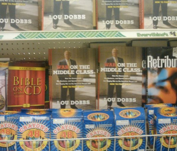 West Coast Xmas warrior operative "Katrina" sends this photo from a fancy dollar store in Portland, Oregon, which just so happens to be the epicenter of the entire War on Christmas . Here we have all the greatest gifts for children and adults and robots alike, and all for one dollar: stacks of Lou Dobbs' book, 48 crayons, and the Bible on CD. (The Bible on CD is just code for "Porn on Blu Ray," is the key!)