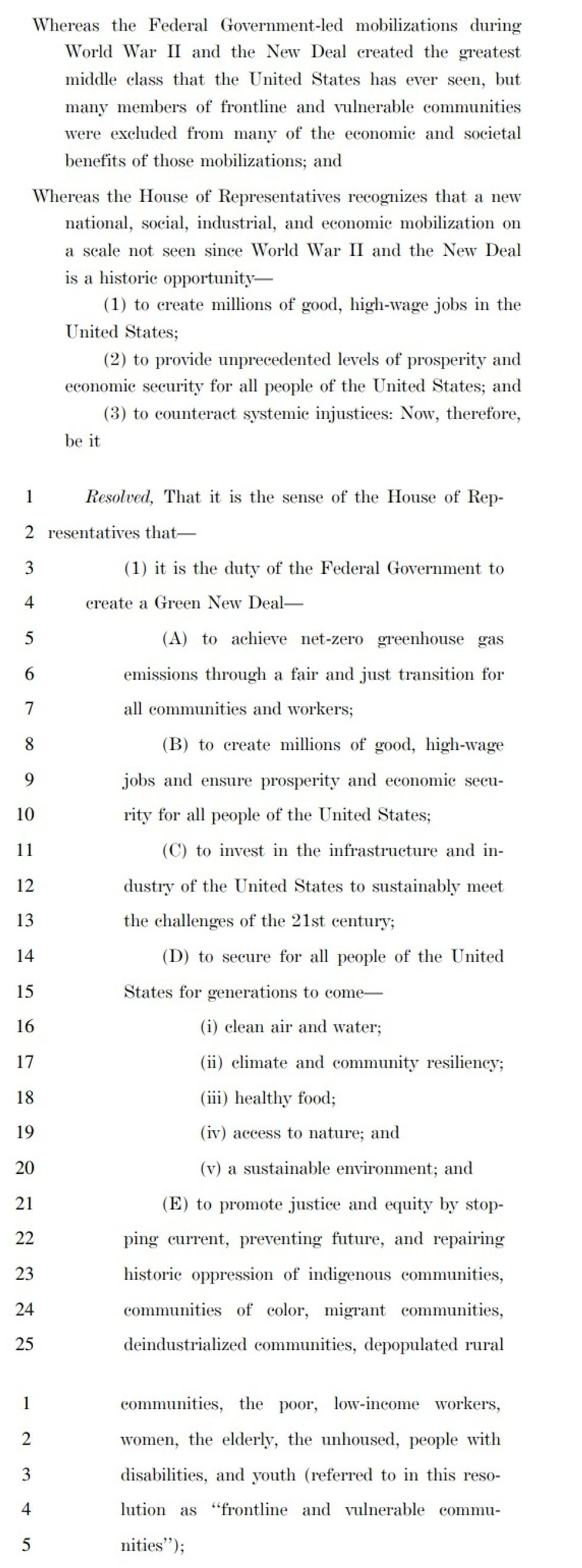 And like the original New Deal, the goal here is public investment for public good: Put government resources into massive growth of clean energy, and the communities where those projects are located will have jobs and, hey, this is nice, cleaner air and better healthcare -- if it's done right. Here, have some whereases and some resolving: