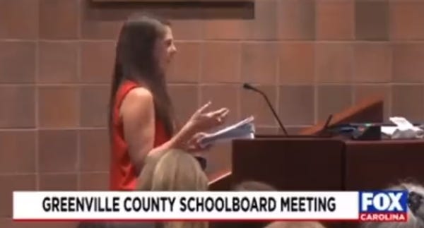 Today we bring you a scene from Greenville County, South Carolina, where you'll be forgiven if you think the former Miss Teen South Carolina has taken up anti-mask, science-denying batshittery. Like pretty much everywhere, in Greenville, there are kids in quarantine, and staff in quarantine, and COVID is a huge deal. This particular meeting was about COVID things, but it wasn't about ... whatever this asshole was talking about.