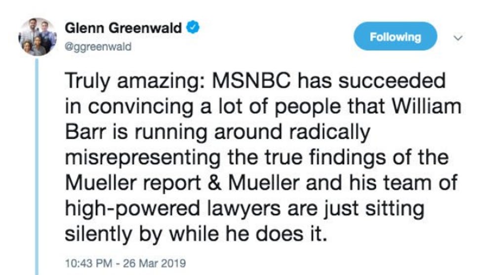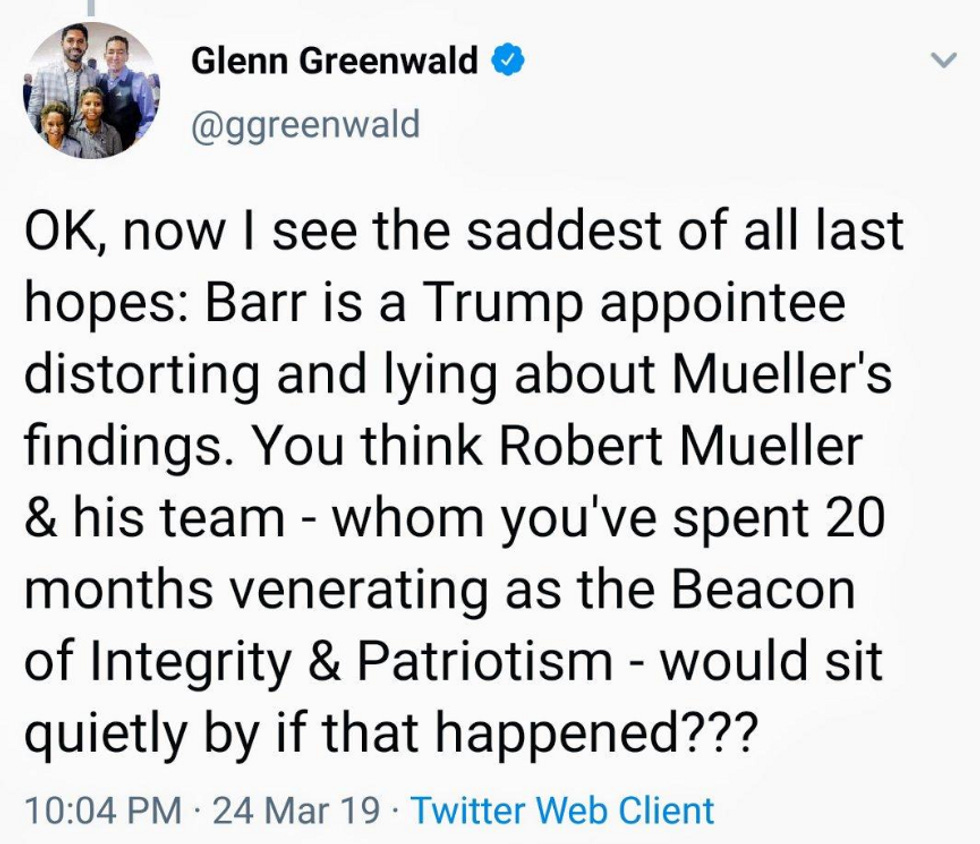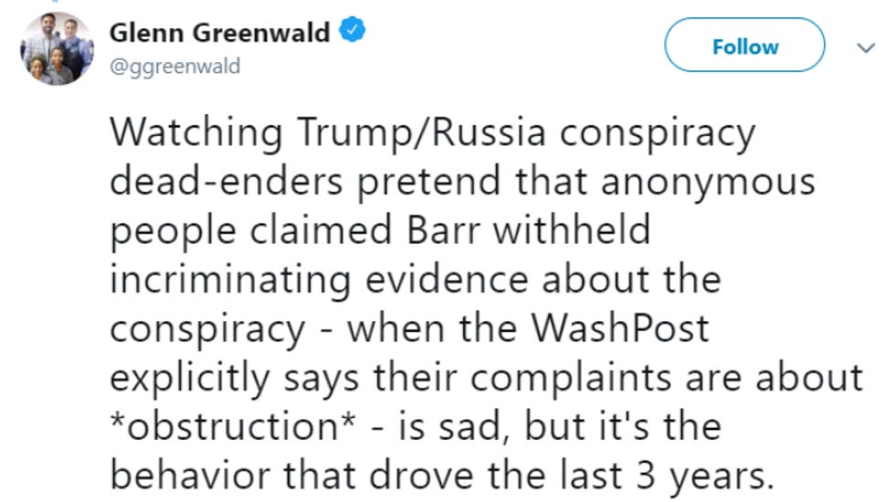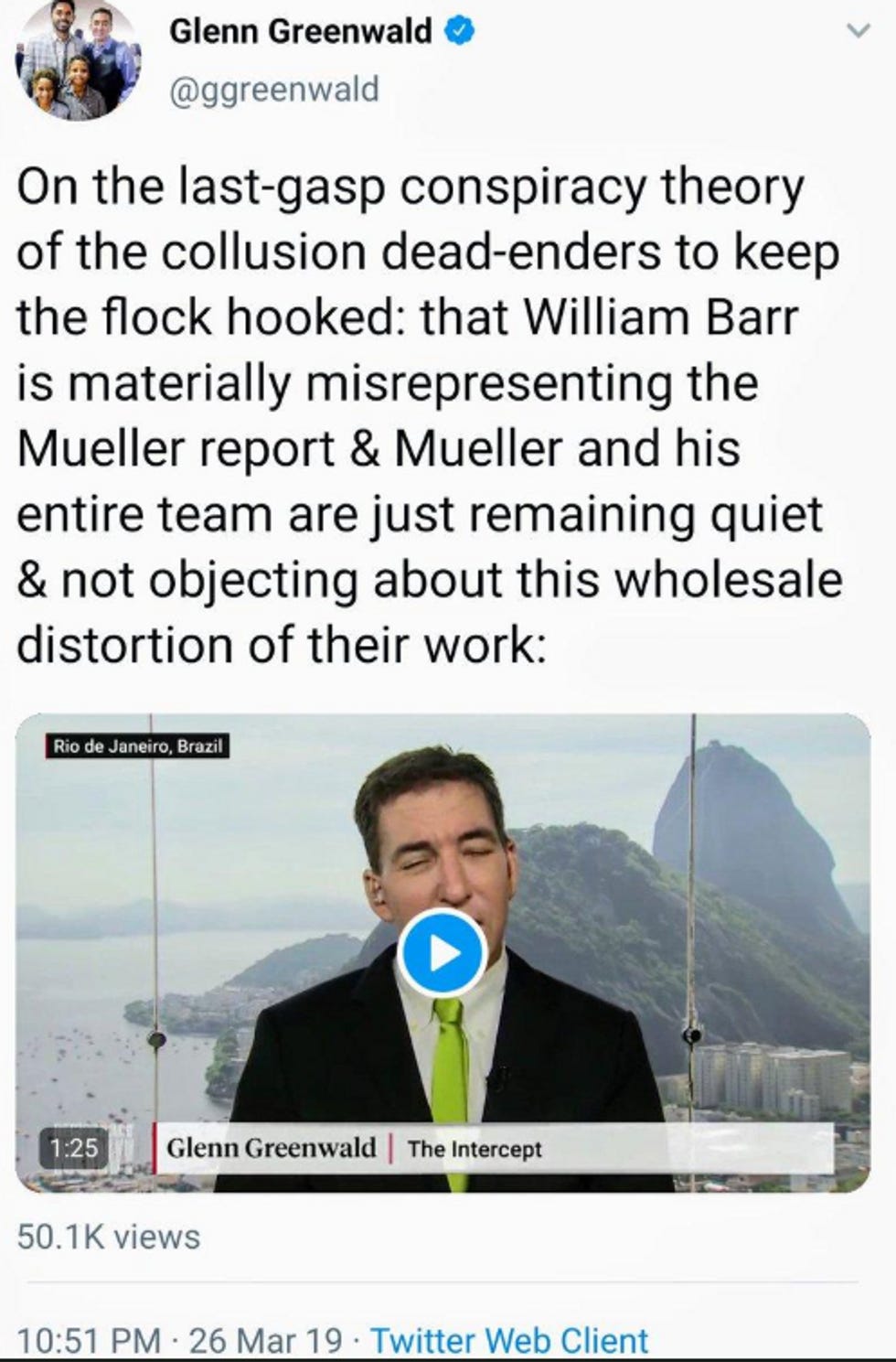 Here's some tweets from Glenn Greenwald about Bill Barr's handling of the Mueller report, just to give you whiplash (compiled by tweeter Nicholas Grossman ):