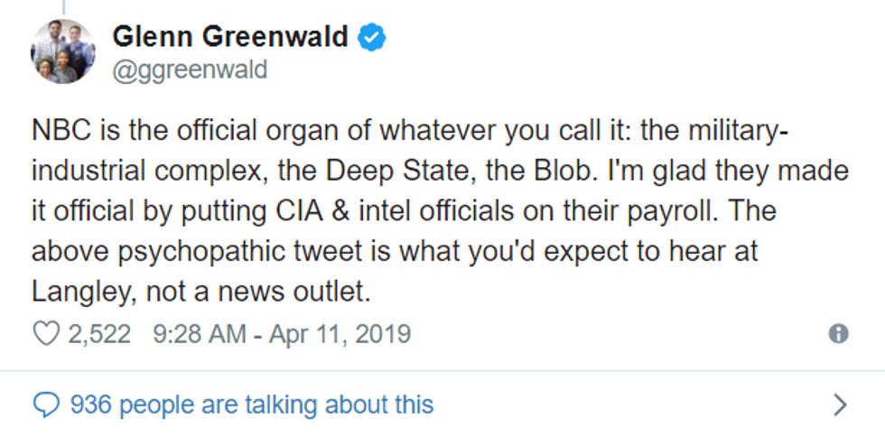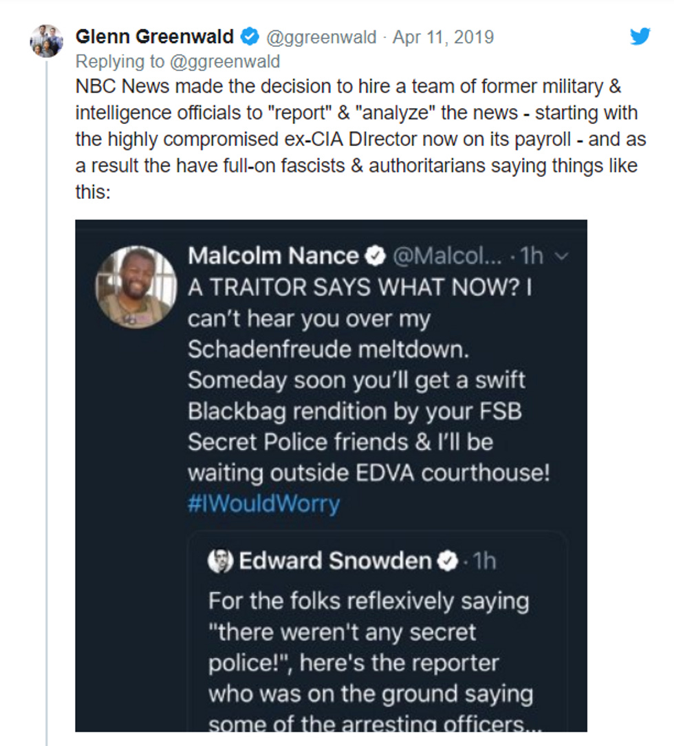 In this one, Glenn Greenwald announces a new three-letter American national security organization, joining the FBI, the CIA and the NSA. It is NBC! The official media organ of DEEP STATE!