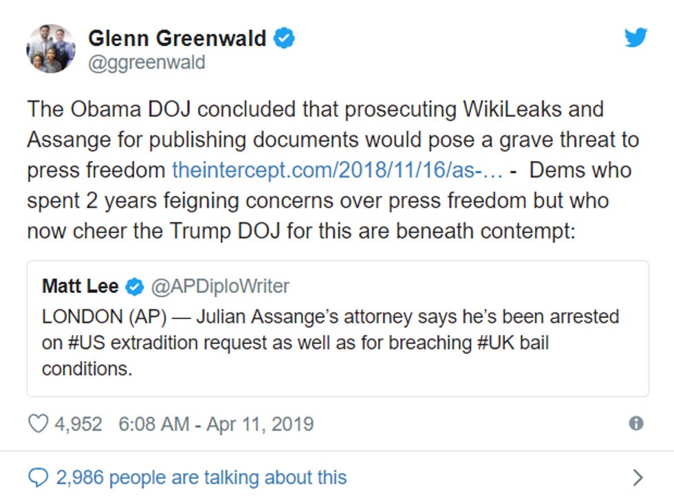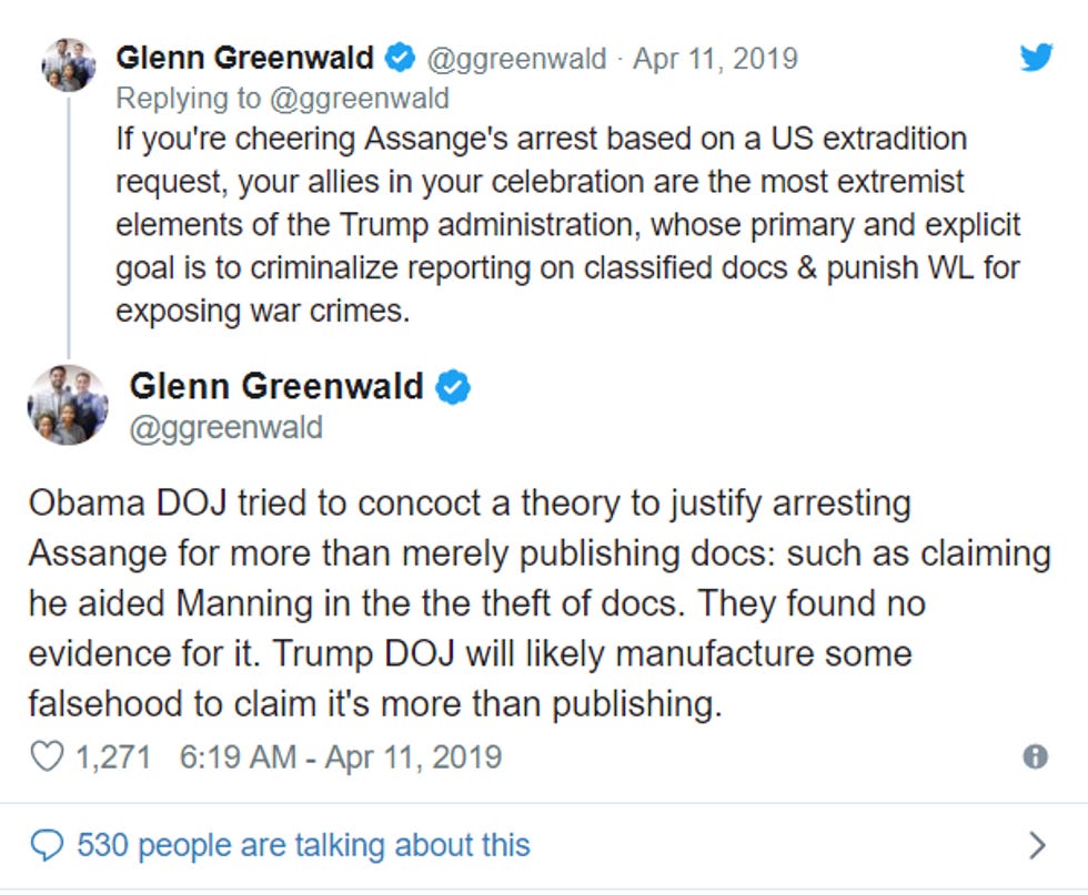 And finally, one of the recurring themes of Greenwald's tweeting has been that Obama 's DoJ (Greenwald types totally hated Obama) thought about prosecuting WikiLeaks, but concluded it would be a threat to press freedom -- they were on the fence, TBH, and that was back when reasonable people argued over whether WikiLeaks was journalism, before it was common knowledge they had become a fully functioning asset of the Russian intelligence apparatus -- but now the Deep State Democrats are totally excited about it. In other words, Glenn is up his own ass again: