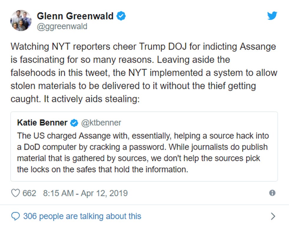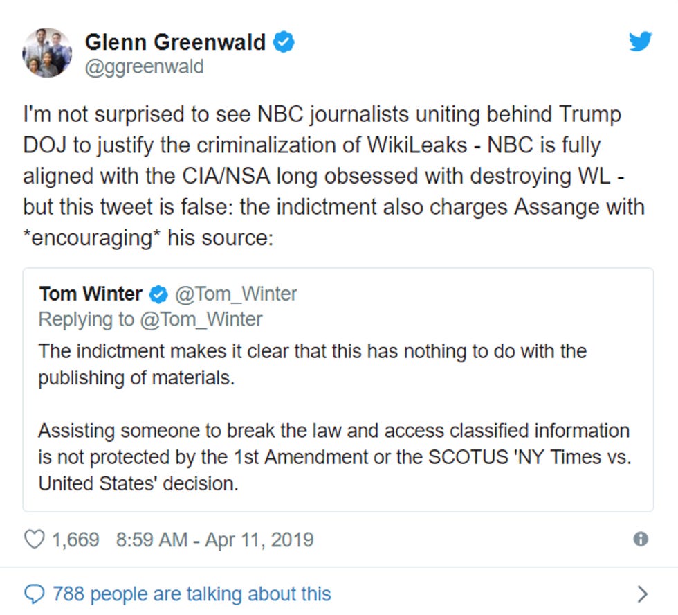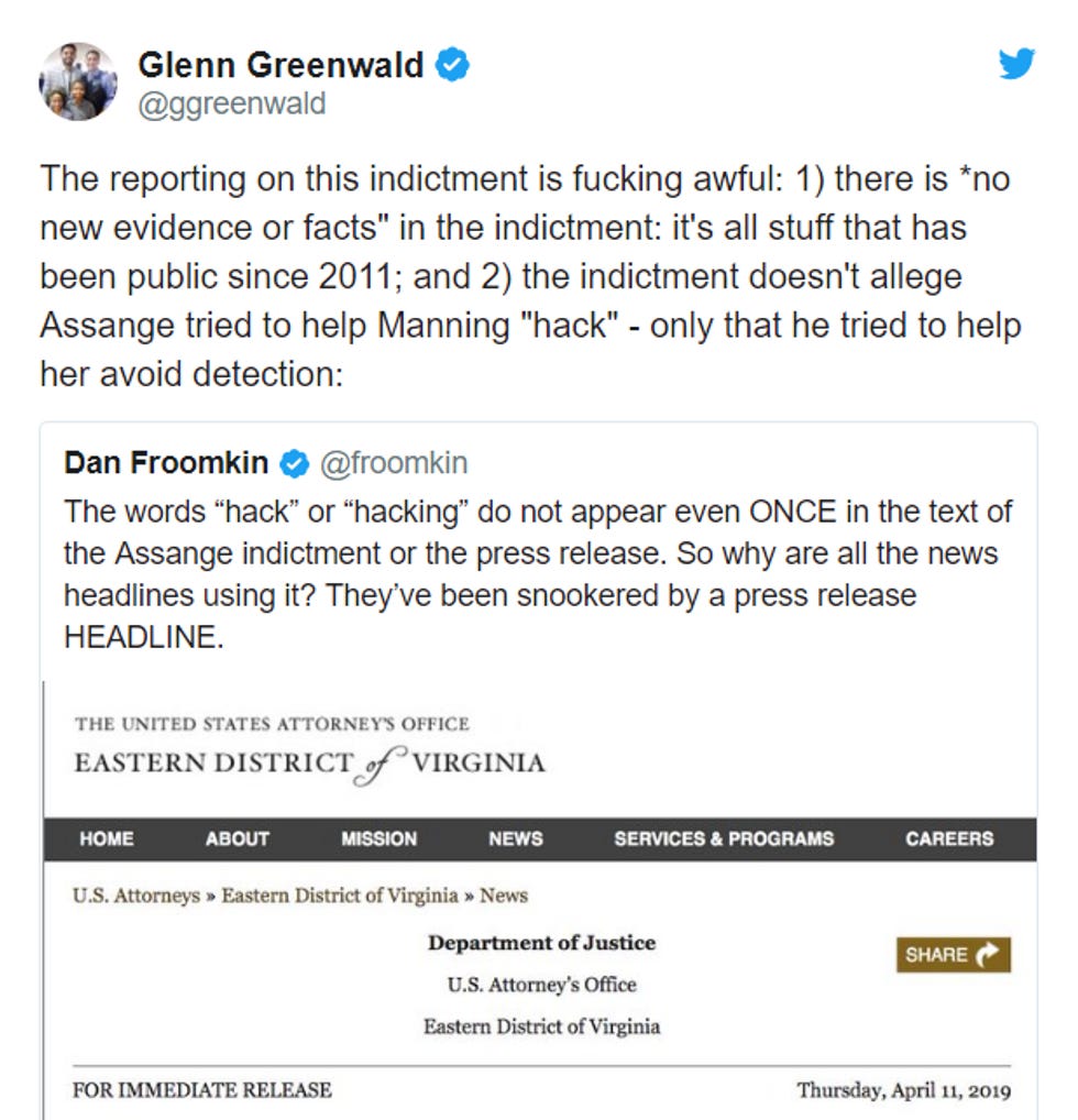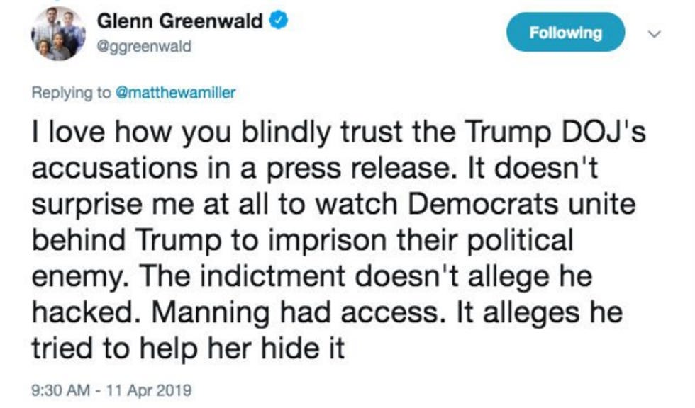 Quick recap: Prosecutors have indicted Julian Assange for something that has zero to do with press freedoms or protecting sources. The allegation, boiled down to its simplest essence, spells out that Assange "agreed to assist [Chelsea] Manning in cracking a password stored on United States Department of Defense computers," and therein lies the difference between this and anything having to do with journalism. Greenwald wants us to be skeptical of the "Trump DOJ's accusations in a press release" (but not the Trump attorney general's "NO COLLUSION!" exonerations in a four page mash note), but those words we quoted right there come directly from the grand jury indictment in the Eastern District of Virginia (EDVA).