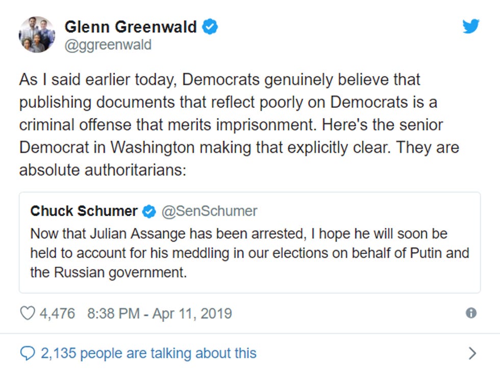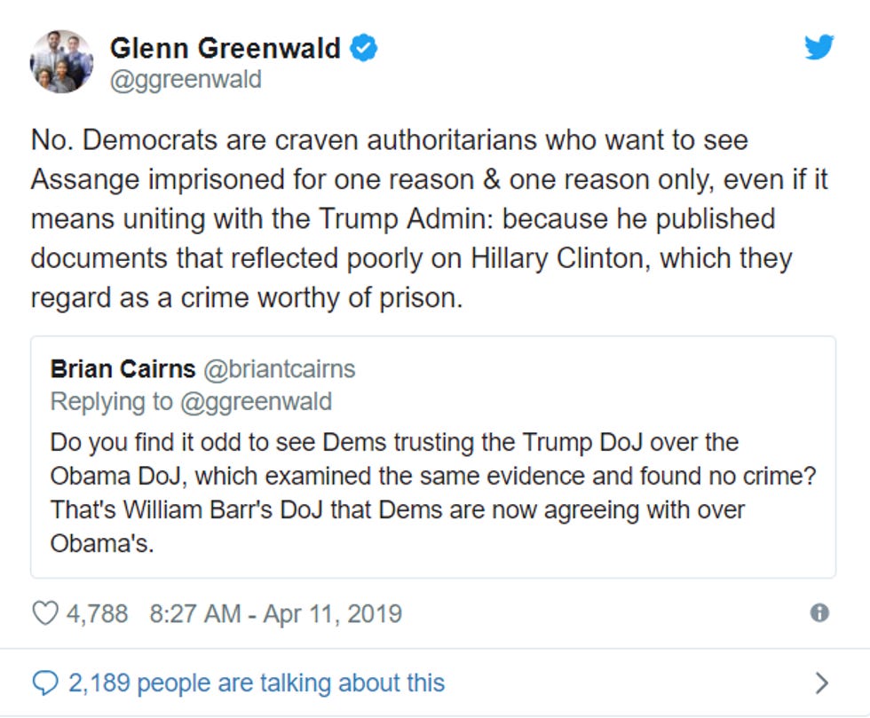 Glenn Greenwald sees the slippery slope of authoritarianism, and it is the Democrats who are about to LOCK HER UP Julian Assange: