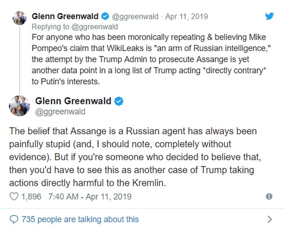 Although ... well ... it is kind of funny that Greenwald and his confrères spent so much time hating Obama and hating Hillary Clinton, and were all too happy to have Russia and WikiLeaks meddling in the election to throw it to Trump (while engaging in the world's most hilarious Russian interference denialism this side of "NO COLLUSION!"), and now Trump's DoJ has nabbed their boy.