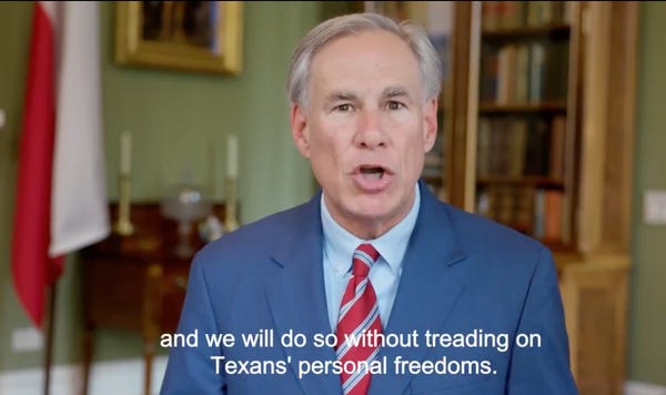Abbott promised to vaccinate more Texans and protect public health but without "treading on Texans' personal freedoms." That's a noble sentiment from a governor who supported a gross bill that would've prevented trans people from using public bathrooms that fit their gender identity.