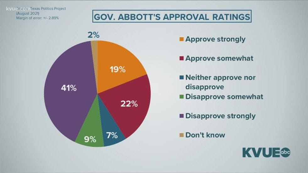 In the middle of all that, new polling from the Texas Politics Project shows Abbott's approval rating underwater, with 41 percent of respondents saying they approve of the job he's doing, and 50 percent saying they disapprove. Another nine percent either didn't know or neither approved or disapproved.