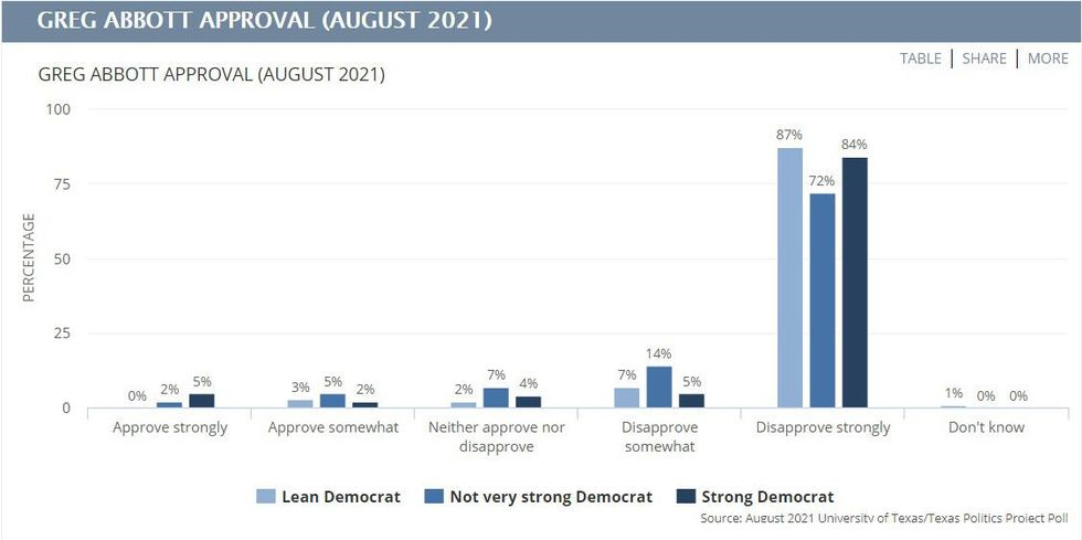 Also worth noting: The 41 percent of respondents who "disapprove strongly" far outweighed the 19 percent who "approve strongly" of how Abbott's been doing. 22 percent "approve somewhat," which we'll assume translates to "Meh, he's a Republican so I guess I have to say I approve, right?" Only nine percent "disapprove somewhat," suggesting that it's difficult to be lukewarm about disliking Abbott.