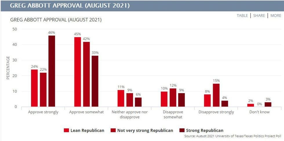The sole bright spot for Abbott is that among self-identified GOP supporters, the more rabid the Republican, the more they support Abbott, with 79 percent of Republicans approving him overall, and 46 percent of those who said they were "strong Republicans" saying they strongly approve of Abbott. Those who merely "lean" or were "not very strong" Republicans were far more likely to just approve "somewhat."