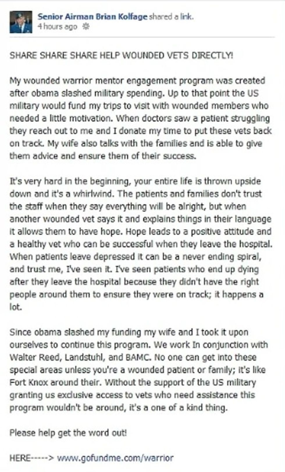 Damn you, obama, you e.e. cummings of vet haters! You can see why Kolfage would later want to photoshop obama's head onto another body and insist in all caps he'd been caught having an affair. It was a matter of justice.