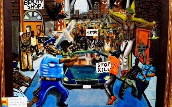 When he selected Pulphus's acrylic painting back in May, Rep. Clay saluted his young constituent's work as "a colorful landscape of symbolic characters representing social injustice, the tragic events in Ferguson, Missouri and the lingering elements of inequality in modern American society," which just goes to show how completely wrong Rep. Clay is, because after all, the painting is not flattering to police officers who put their lives on the line on a daily basis to protect the rights of scum like David Pulphus. Who therefore should not be allowed to have his art hanging in a government building, because LOGIC.