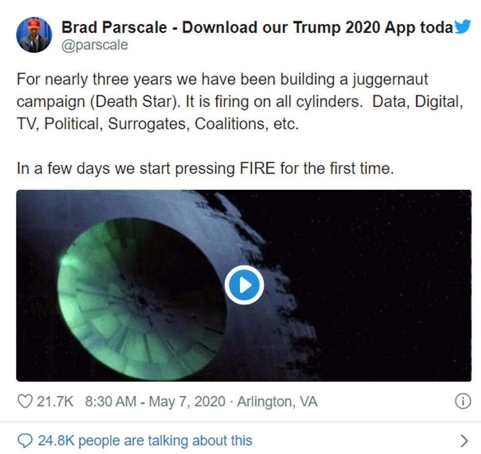— Brad Parscale - Download our Trump 2020 App today! (@Brad Parscale - Download our Trump 2020 App today!) 1588861395.0