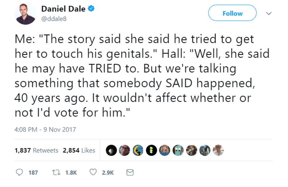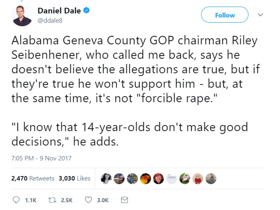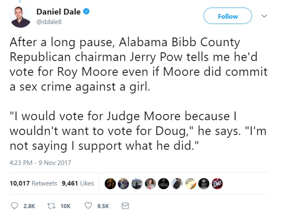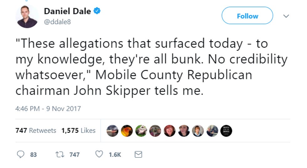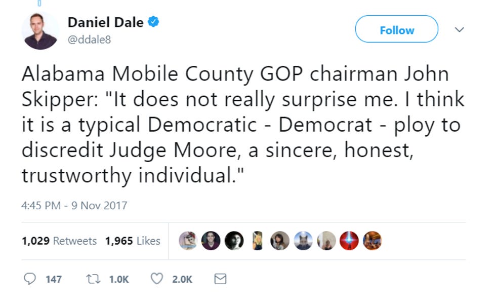Daniel Dale of the Toronto Star ventured into the hinterlands to find out how Alabama GOP figures feel about the Moore allegations. SURPRISE, they think bitches be lyin'! Wonkette recommends you never let any of the following men babysit your young daughters.