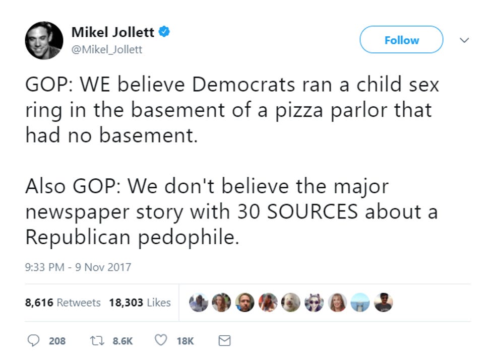 This is really how they are. They'd rather take the chance that their guy is a kid-toucher, because at least he's THEIR kid-toucher and not a ... shudders ... DEMOCRAT! That is how much Fox News has brainwashed them.